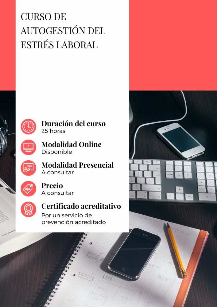 Nuestro Curso de Autogestión del Estrés Laboral es una formación de 25 horas, que puede realizarse de manera presencial u online, el cual te proporcionará las herramientas necesarias para identificar, comprender y abordar el estrés laboral de manera efectiva. Está dividido en tres módulos, en el primer módulo comprenderás qué es el estrés y sus consecuencias, en el segundo módulo aprenderás estrategias para afrontarlo tanto cognitiva como emocionalmente, y en el tercer módulo te familiarizarás con técnicas de relajación que podrás aplicar en tu vida laboral diaria.