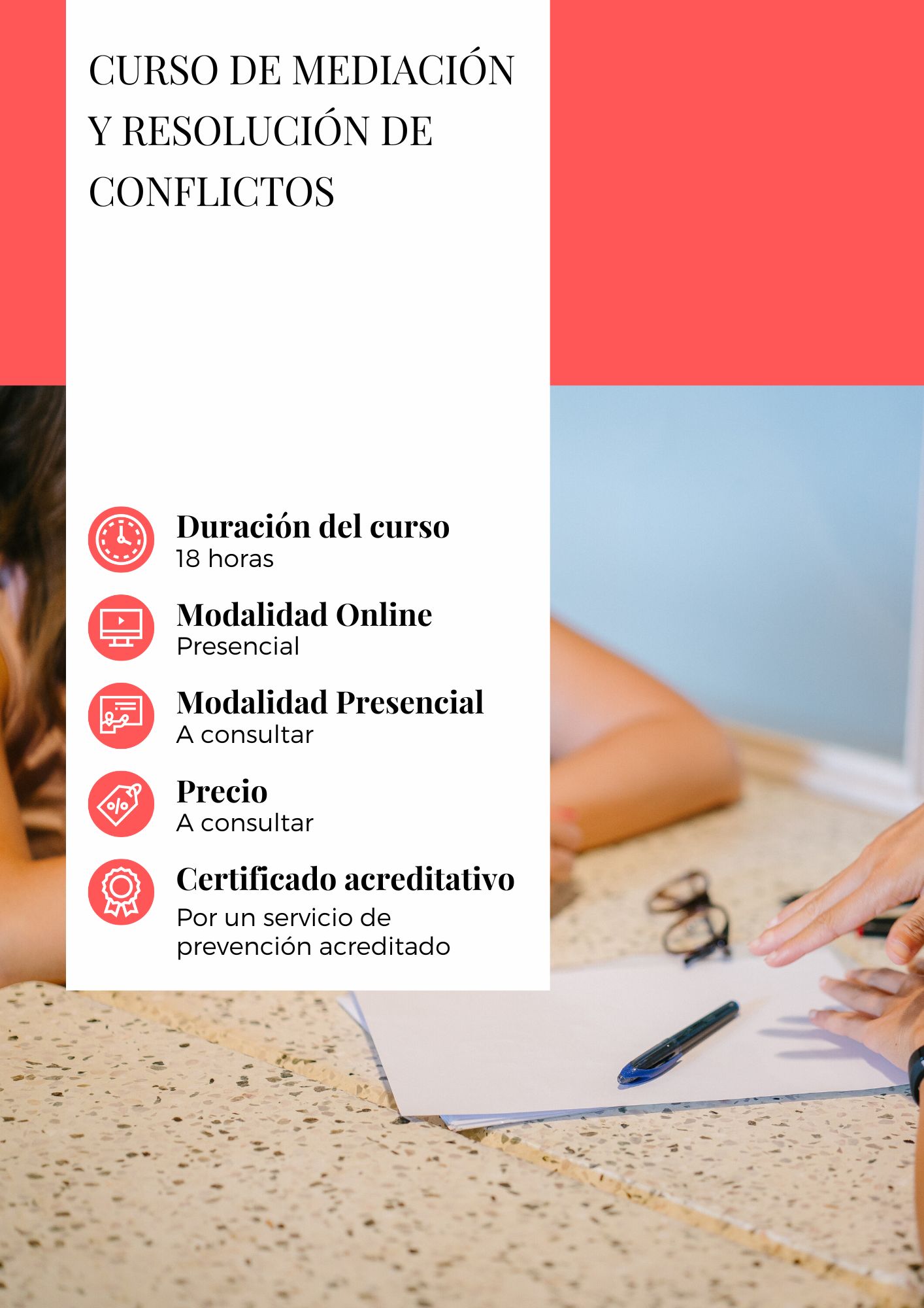 El Curso de Mediación y Resolución de Conflictos consiste en una formación de 18 horas, que se puede realizar de manera presencial u online, y que está diseñado para aquellos profesionales que desempeñarán el papel de mediadores en sus entornos laborales, incluyendo mandos intermedios, gerentes, personal de recursos humanos y prevencionistas.